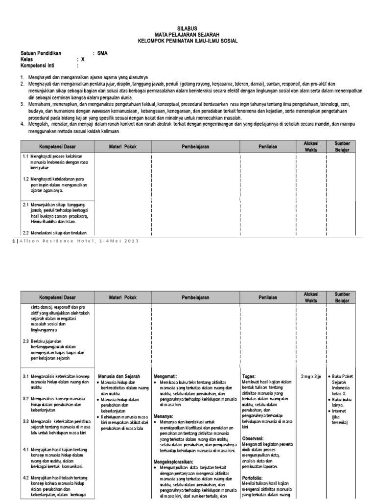 Gampang dipelajari oleh siswa (learnable); Download silabus mapel sejarah indonesia kelas x (10) sma/ma kurikulum 2013 revisi tahun 2021. Silabus sejarah indonesia kelas x k13 revisi 2020 , yang digunakan saat ini ada yang sudah menerapakan kurikulum 2013. Download silabus k13 sejarah indonesia kelas xi disini. Kd sejarah dok mapel sejarah silabus sejarah indonesia. Asean, non blok, dan misi garuda serta menyajikannya dalam bentuk laporan laporan tertulis. Aries eka prasetya, s.pd, m.si. Semua bidang keahlian kelas /semester : Smk indonesia mata pelajaran : Silabus sejarah indonesia kelas 10 semester 1 dan 2 kurikulum 2013. Semua bidang keahlian kompetensi keahlian : Perangkat pembelajaran tersebut sedikit berguna bagi kamu yang mengampu mata pelajaran sejarah indonesia di kelas x sma/smk. Perangkat pembelajaran silabus kurikulum 2013 mata pelajaran sejarah indonesia kelas 10 sma/smk yang akan saya bagikan pada kesempatan ini dapat anda jadikan sebagai bahan referensi dalam melengkapi perangkat pembelajaran anda di sekolah.